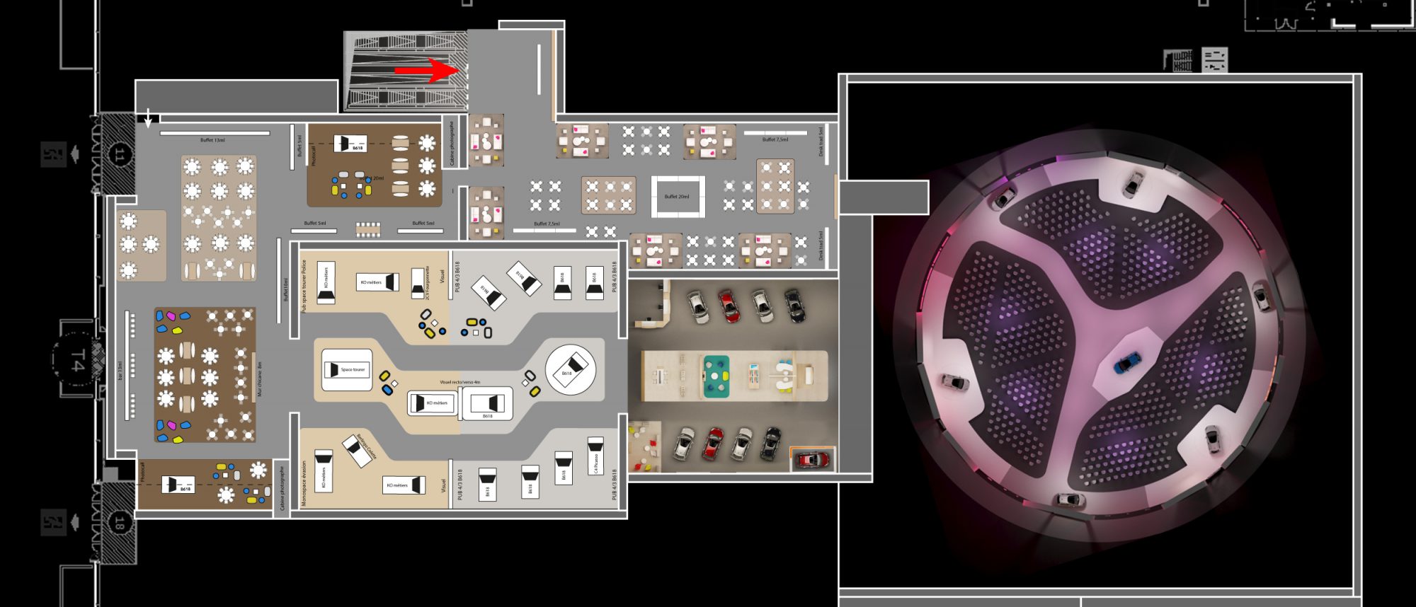 La scénographie de l’espace plénière se dessine le long d’une route circulaire où viennent défiler les voitures : des chemins en étoile se déploient sous les écrans massifs capitonnés et finissent le parcours sur la scène centrale.